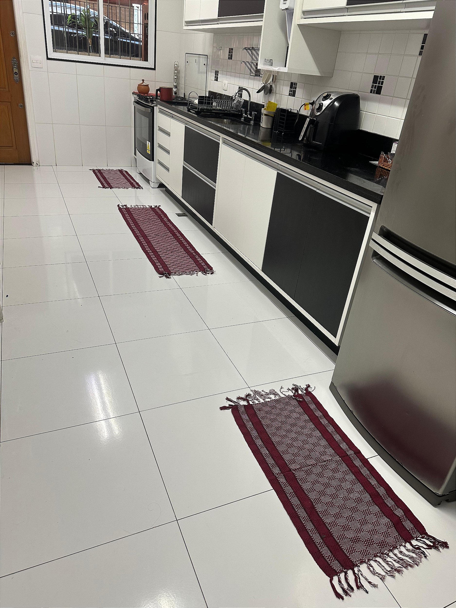 2. Tapetes de Cozinha (Dois): Os tapetes de cozinha são peças menores de tapete que geralmente são colocadas em áreas específicas, como na frente do fogão e da geladeira, para fins semelhantes à passadeira. Suas funções incluem: